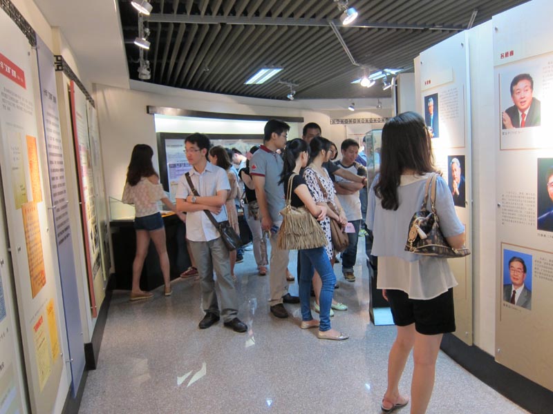 公司員(yuán)工(gōng)在凝神觀看(kàn)校(xiào)史€♠>館內(nèi)展品