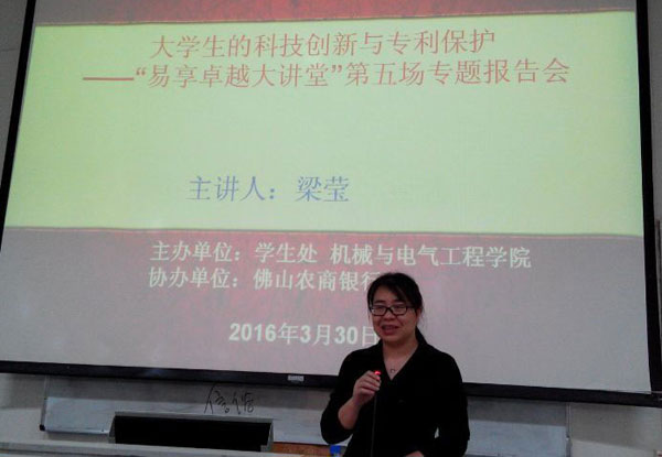 2016年(nián)3月(yuè)30日(rì),公司股東(dōng≠•)梁瑩應邀參加了(le)由佛山(shān)科(kē)學技(£♥jì)術(shù)學院學生(shēng)處、機(jī)械與電(diàn)≤δ♦₹器(qì)工(gōng)程學院聯合主辦、佛山(shān)農(nóng)商銀(yín)行× (xíng)承辦的(de)“易享卓越大(dà)講堂第五場(c≥λhǎng)專題報(bào)告會(huì)”。來(lái)自(z ≠≈ì)佛山(shān)科(kē)學技(jì)術(shù)學院的(de)廣大(dàδ✘♣)師(shī)生(shēng)近(jìn)百人(rén)參加了(le)此次報(bào)φ✘告會(huì)。