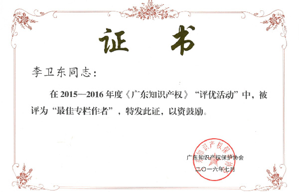 近(jìn)日(rì),從(cóng)廣東(dōng)知(zhī)識産權保護協會§φ₩(huì)獲悉,公司執行(xíng)董事(shì)李'★衛東(dōng)在2015-2016年(nián)度《廣東(dōng)知(zhī₹• )識産權》“評優活動”中,獲評“最佳專欄作(zuò)者”榮譽稱号。李衛東(d≥ōng)作(zuò)為(wèi)《廣東(dō← ≈ ng)知(zhī)識産權》特邀專欄作(zuò)者,先後發表《夯φ∑≠實專利代理(lǐ)基礎,助推創新驅動發展》、《專利代理(lǐ)機(jī)構貫标刍議© ∞®(yì)》、《對(duì)知(zhī)識産權本質的(de)思考》等文₹φ(wén)章(zhāng),獲得(de)了$✔(le)同行(xíng)及社會(huì)各界的(de)一(yī)緻好(hǎo)評。